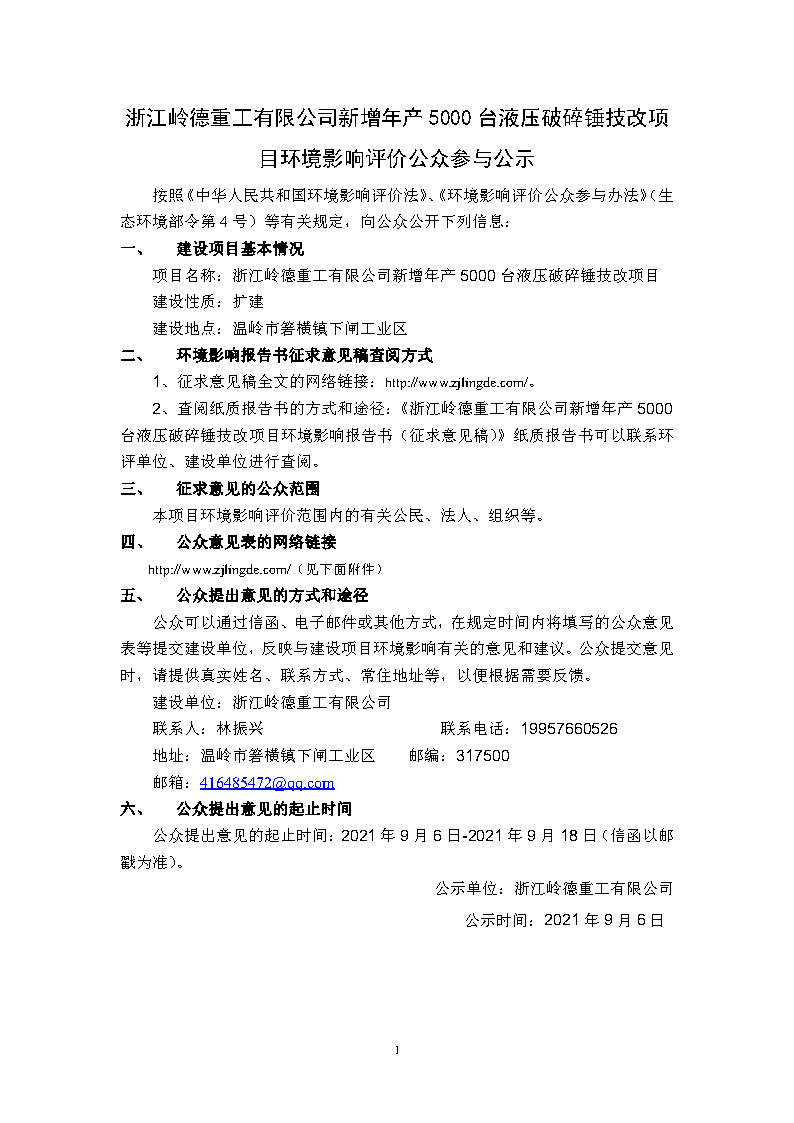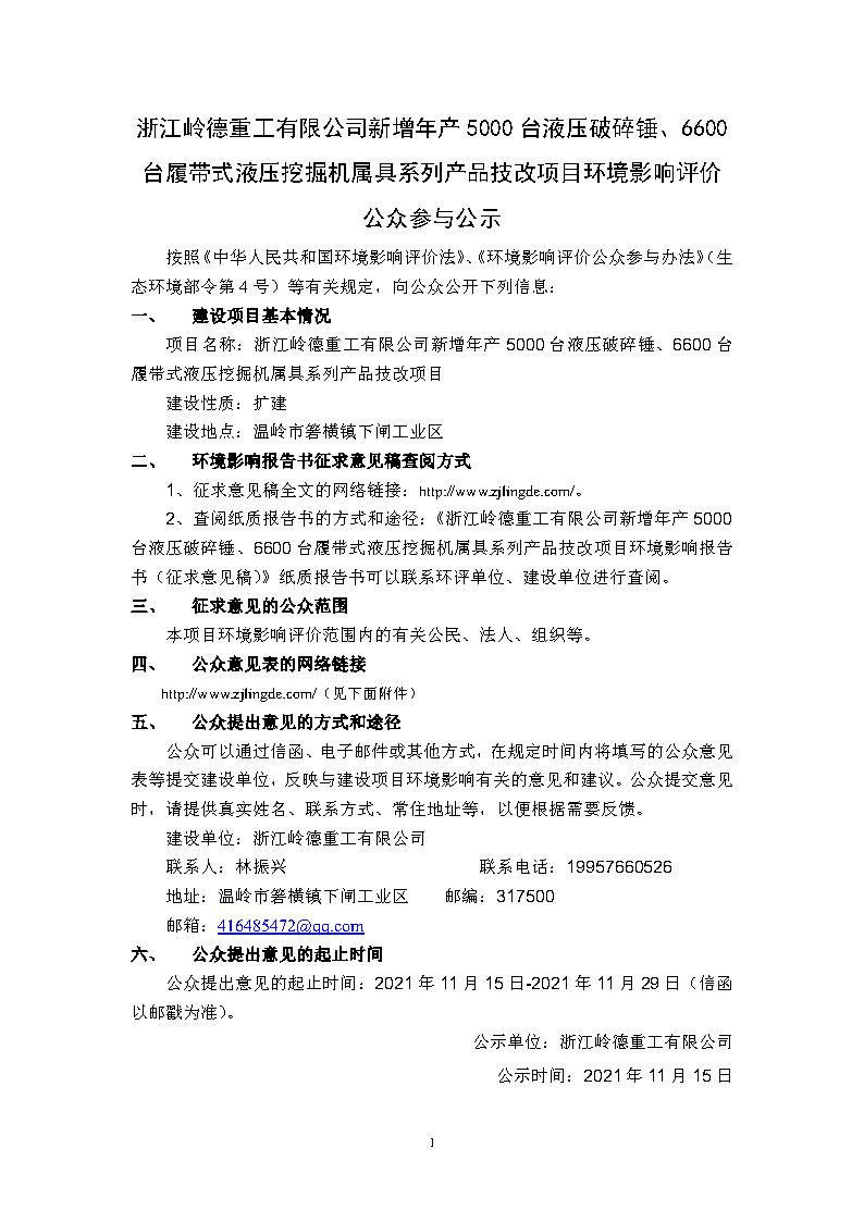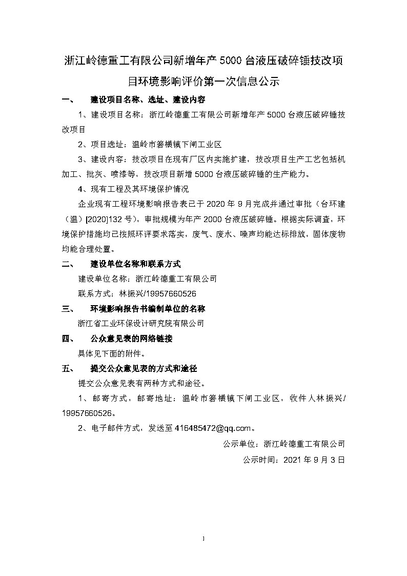 浙江嶺德重工有限公司新增年產(chǎn)5000臺液壓破碎錘技改項目環(huán)境影響評價第二次信息公示