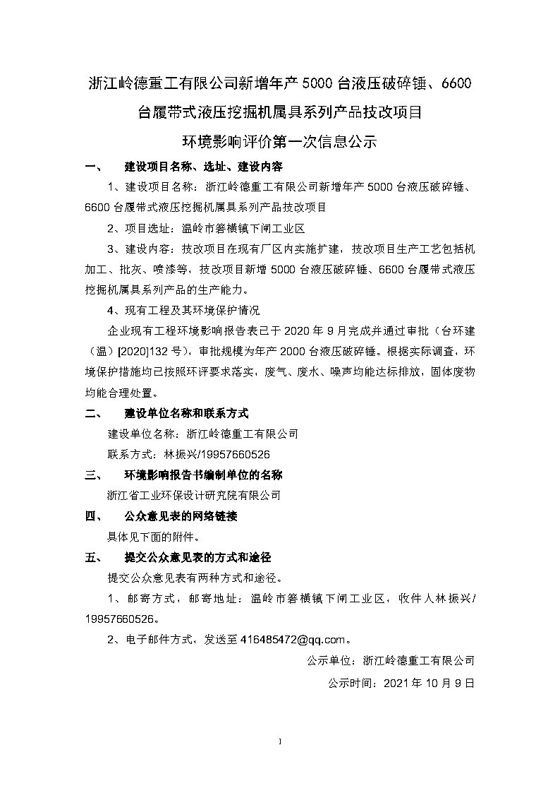 浙江嶺德重工有限公司新增年產(chǎn)5000臺液壓破碎錘、6600臺履帶式液壓挖掘機(jī)屬具系列產(chǎn)品技改項目環(huán)境影響評價第一次信息公示