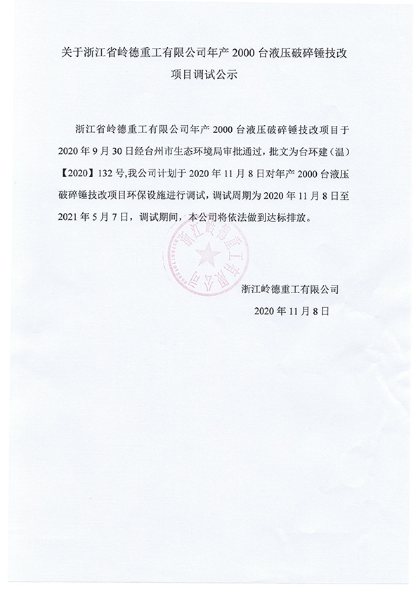浙江嶺德重工有限公司年產(chǎn) 2000臺(tái)液壓破碎錘項(xiàng)目竣工環(huán)境保護(hù)驗(yàn)收公示